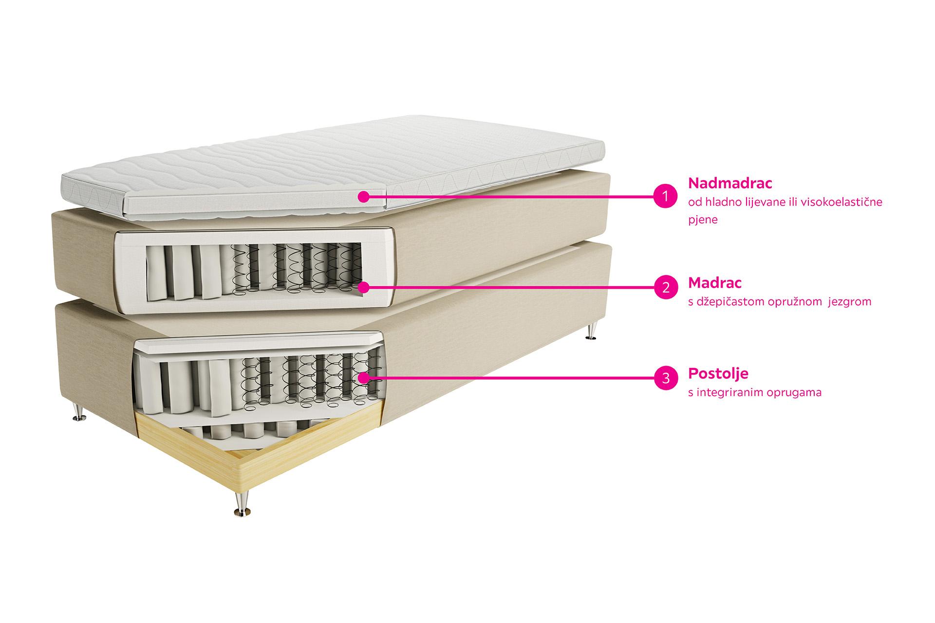 Ako ste ikada ležali na boxspring krevetu shvatili ste zašto je taj krevet toliko omiljen. Razlog za neusporedivu udobnost je način na koji su boxspring kreveti sastavljeni, a šlag na torti su dodatna oprema te mogućnost širokog izbora tkanina i dimenzija.